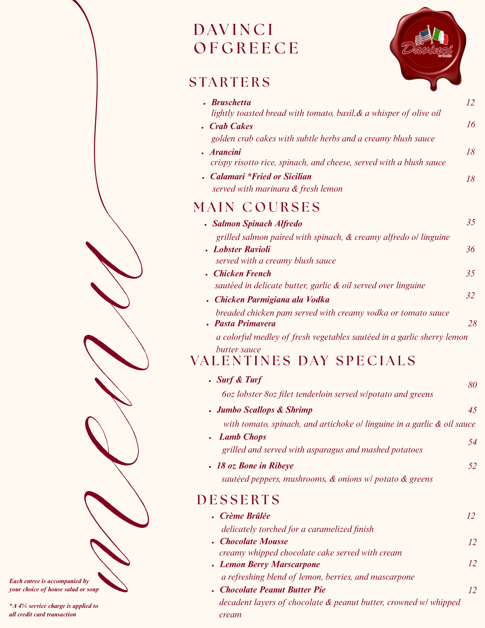 The Davinci Family would like to thank you for your continued support through these uncertain times. Come enjoy the new dining experience on our patio or in our renovated dining room. Please know that we keep your health & safety as a top priority by following all standards & cleaning protocols.